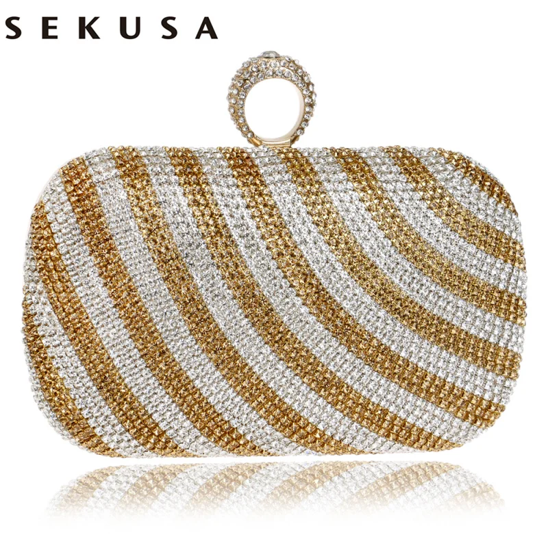 SEKUSA Strip Design Women Evening Bags Finger Rings Diamonds Purse Day