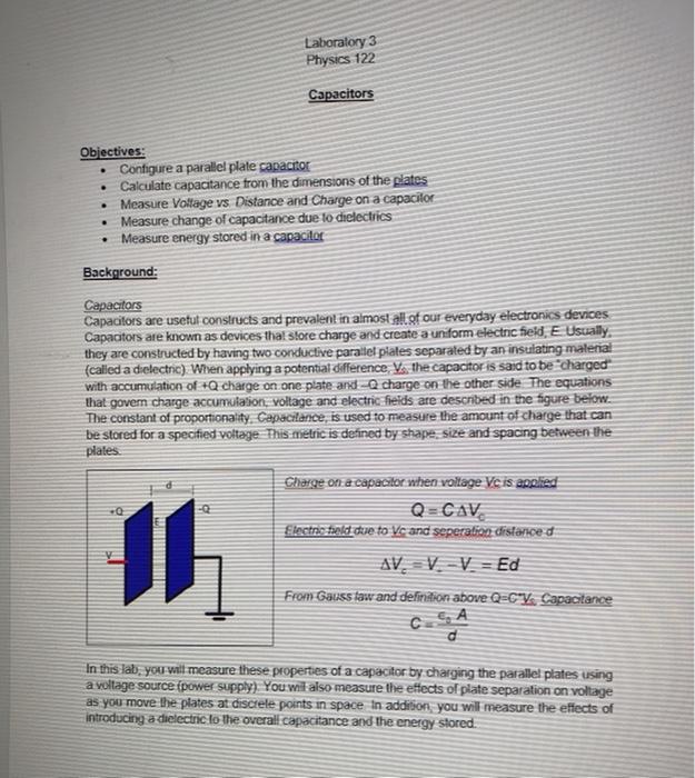Solved Laboratory 3 Physics 122 Capacitors . Objectives