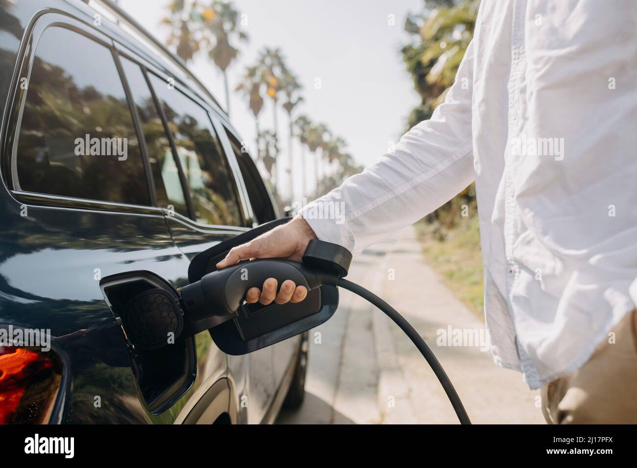 Man plugging charging cord into electric car on road at station Stock
