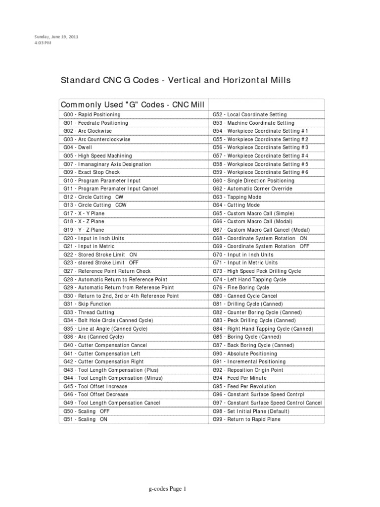 Common G Codes and M Codes for CNC Machine Controls Drilling Crafts Printable Cnc G Code List In this blog post, we present the ultimate cnc machine g code list, covering an extensive range of commands and functions. Basic g codes milling g00 move at rapid speed g01 feed in a straight line g02 clockwise arc g03 counter clockwise arc g04 time dwell g28. Every g code command sorted by how often they are used and organized. Printable Cnc G Code List.