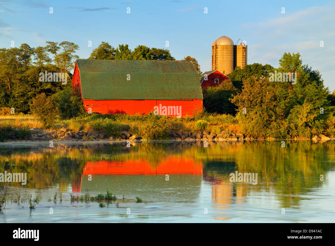 An aging red barn reflected into Gibson Lake waterway hydro controlled