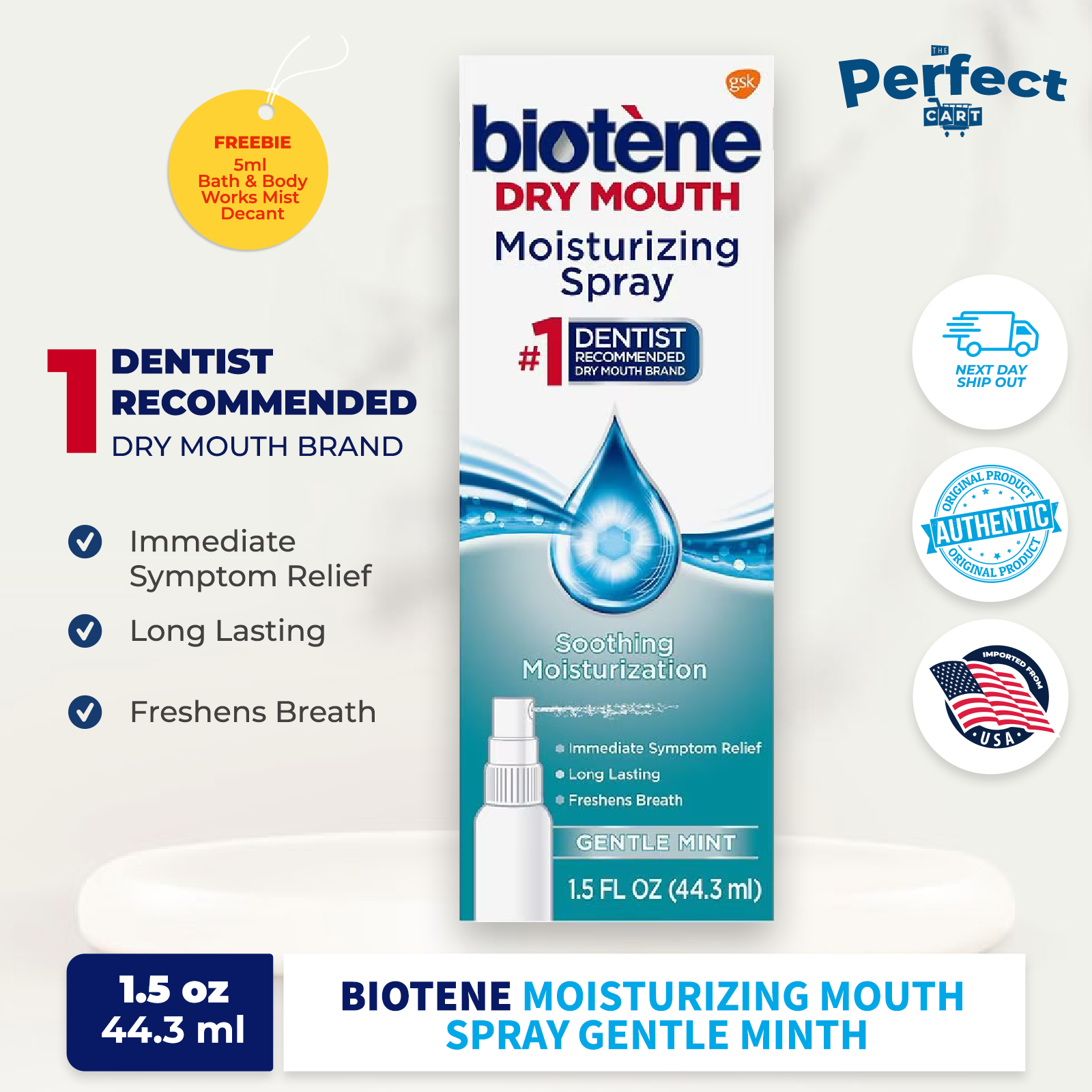 Biotene Gentle Mint Moisturizing Mouth Spray, SugarFree, for Dry Mouth Moisturizing Mouth Spray Gentle Mint #1 dentist and hygienist recommended spray for relief of dry mouth symptoms ; Use biotène moisturizing mouth spray. This soothing mouth moisturizer spray provides up to four hours of relief from dry mouth symptoms, including bad breath, stickiness in the mouth, dryness in the mouth and chapped lips. For immediate relief of dry mouth symptoms ; Experiencing constant dry mouth. Moisturizing Mouth Spray Gentle Mint.