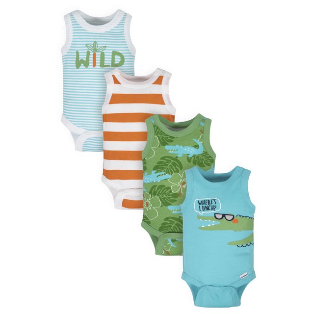 Gerber Baby Boy Tank Onesies Bodysuits, 4Pack, Sizes Newborn 24 Months Baby Boy Tank Bodysuit Garments are designed to fit snug for child's safety. You'll love our cozy classics, ethically made of 100% organic cotton for your baby boy or girl. Machine washable for easy care. This pack of four baby. Price and other details may vary based on product size and color. Ribbed neckline for comfy fit. Convenient design features easy on/off. Convenient snaps. Baby Boy Tank Bodysuit.
