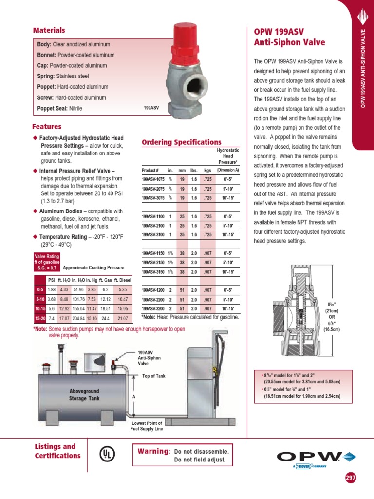Materials Opw 199asv AntiSiphon Valve PDF Valve Gasoline Anti Siphon Valve Opw The 199asv installs on the top of an aboveground storage tank with a suction rod on the inlet and the fuel supply line (to a remote pump) on the outlet of the valve. Anti Siphon Valve Opw.
