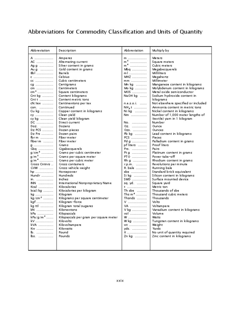Abbreviations For Commodity Classification and Units of Quantity