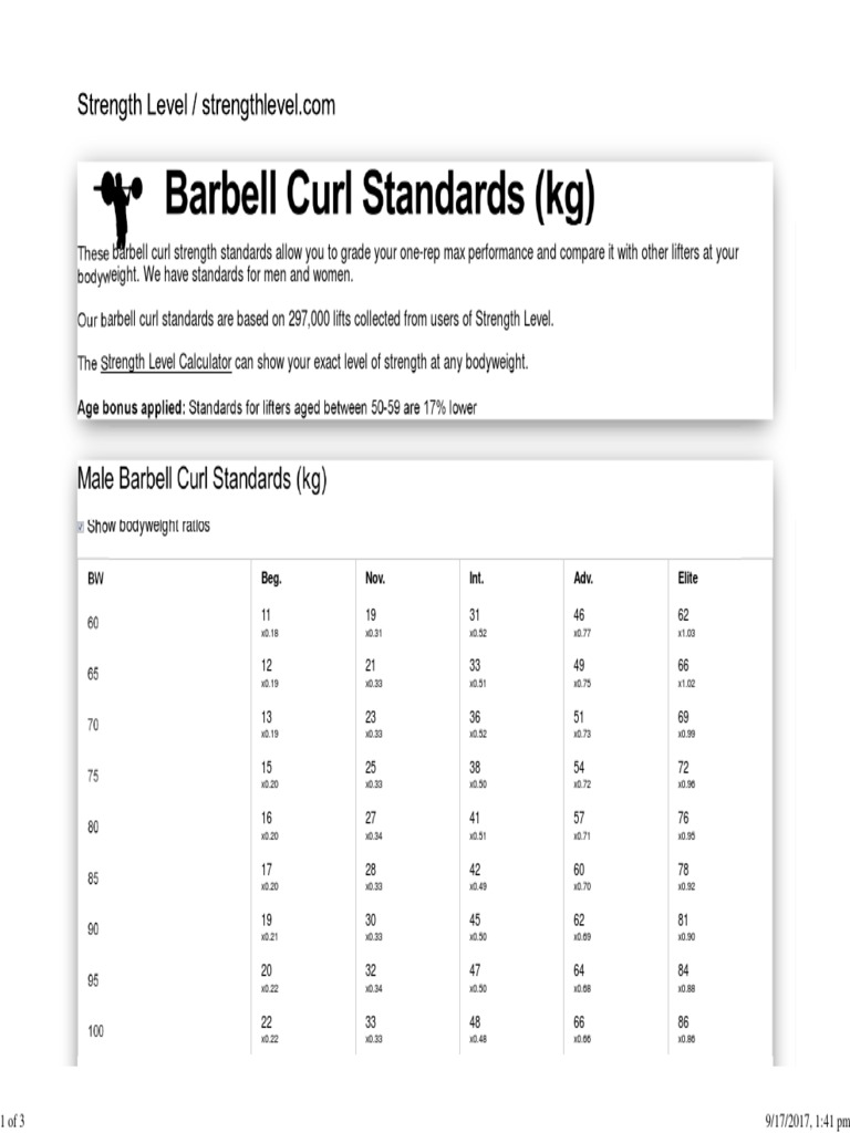 Barbell Curl Standards For Men and Women (KG) Strength Level PDF