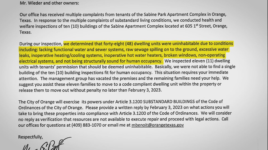 Letter reveals details aboutvconditions Sabine Park Apartments
