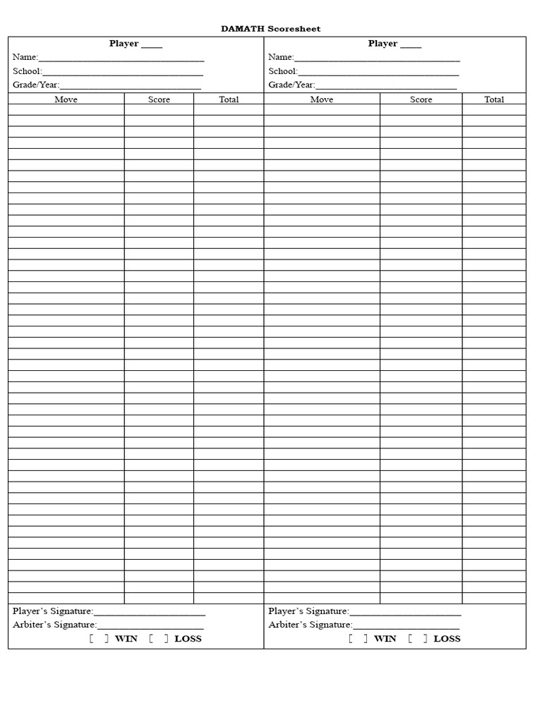 Damath Score Sheet PDF Damath Score Sheet Example Record your move in the scoresheet. This document is a score sheet for a game called damath containing columns for player 1 and player 2's moves and scores. This document is a scoresheet for a game called damath. It contains spaces to record the moves and scores of two players over multiple rounds, along. It includes spaces to record each. Damath Score Sheet Example.