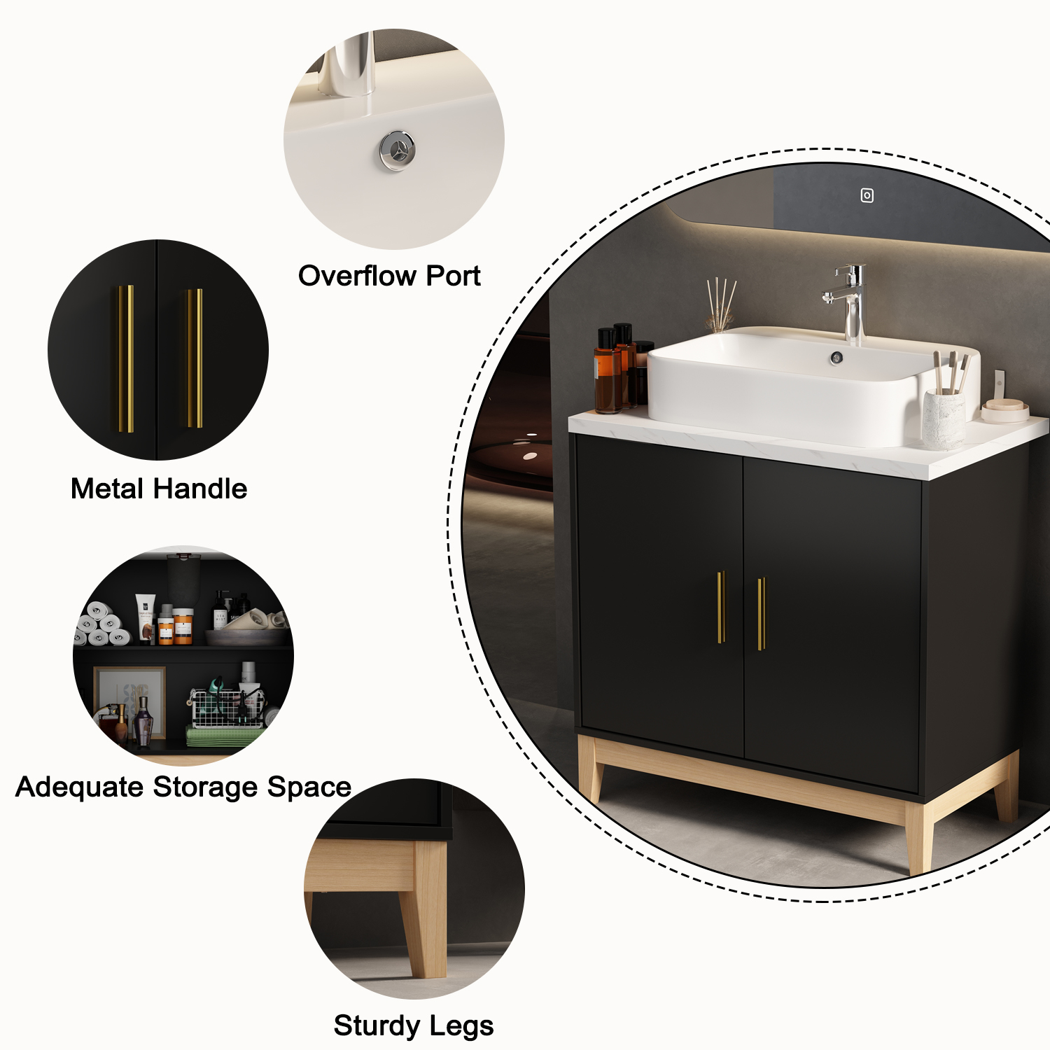 Black 60" Bathroom Vanity Solid Wood w/ Vessel Sink