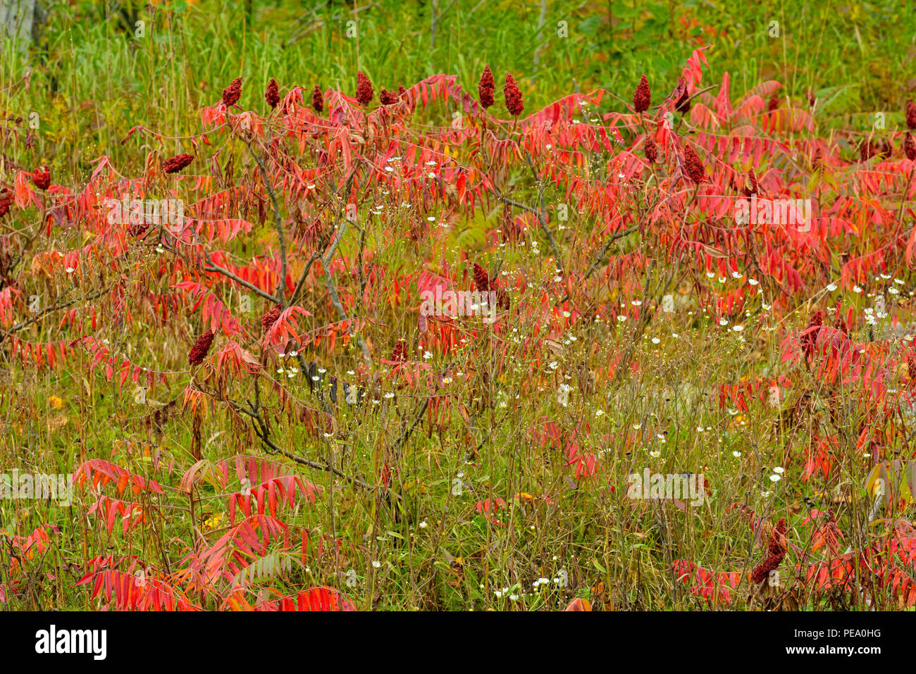 Autumn staghorn sumac (Rhus typhina) and asters, Pointe au Baril