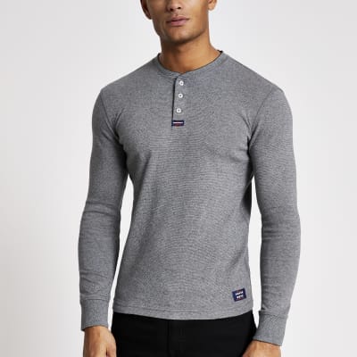 Superdry grey grandad collar Tshirt River Island