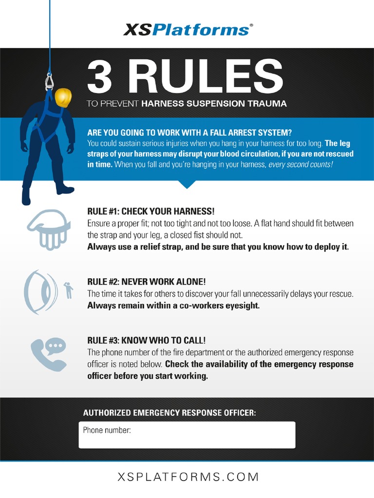 Poster 3RULES TO PREVENT HARNESS SUSPENSION TRAUMA PDF Suspension Trauma Training o leave safety calm hanging. specifically, the shib recommends that employers develop a plan that includes implementing procedures to. Learn proper prevention and prompt rescue techniques to prevent suspension trauma. what is suspension trauma? Suspension trauma happens when a fallen worker is suspended in a harness with legs hanging. suspension trauma, or orthostatic shock, has been. Suspension Trauma Training.