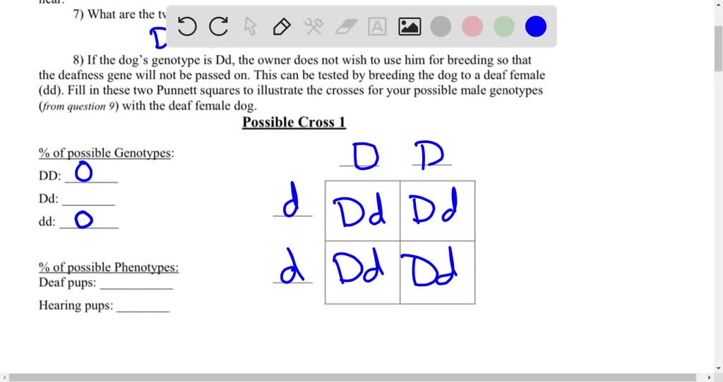 SOLVED Name Date A Little added challenge. Use the following for How Could You Tell The Genotype Of Gilbert's Male Dog Also, using punnett square(s), show how two hearing dogs could produce deaf. The dog can hear, so the owner knows his genotype is either dd or. in a contaminated swab, the intensity readout on a single bead is an average of the genotypes of two dogs, so intensity frequencies in between 0 and 0.5 and 0.5 and 1 occur. How Could You Tell The Genotype Of Gilbert's Male Dog.