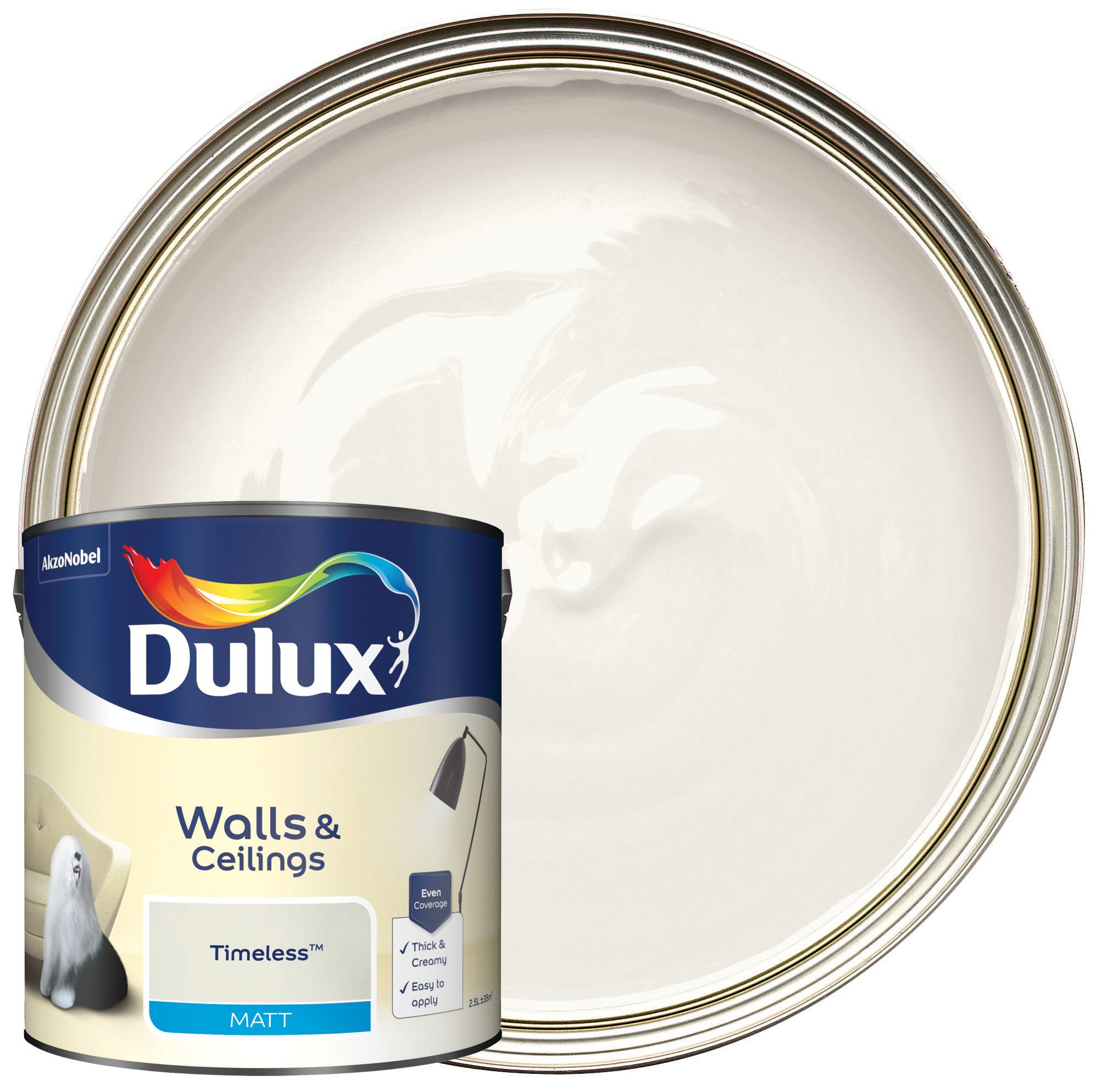 Dulux Matt Emulsion Paint Timeless 2.5L Wickes.co.uk B&Q Dulux Paint Timeless Discover dulux's timeless paint a beautiful, distinctive and versatile shade of white perfect for every room. The dulux matt emulsion paint is a smooth and creamy emulsion paint for use on walls and ceilings which is ideal for a modern, flat finish. Sold & shipped by b&q. Just one coat needed, compared to 2 coats of dulux matt. Dulux easycare. B&Q Dulux Paint Timeless.