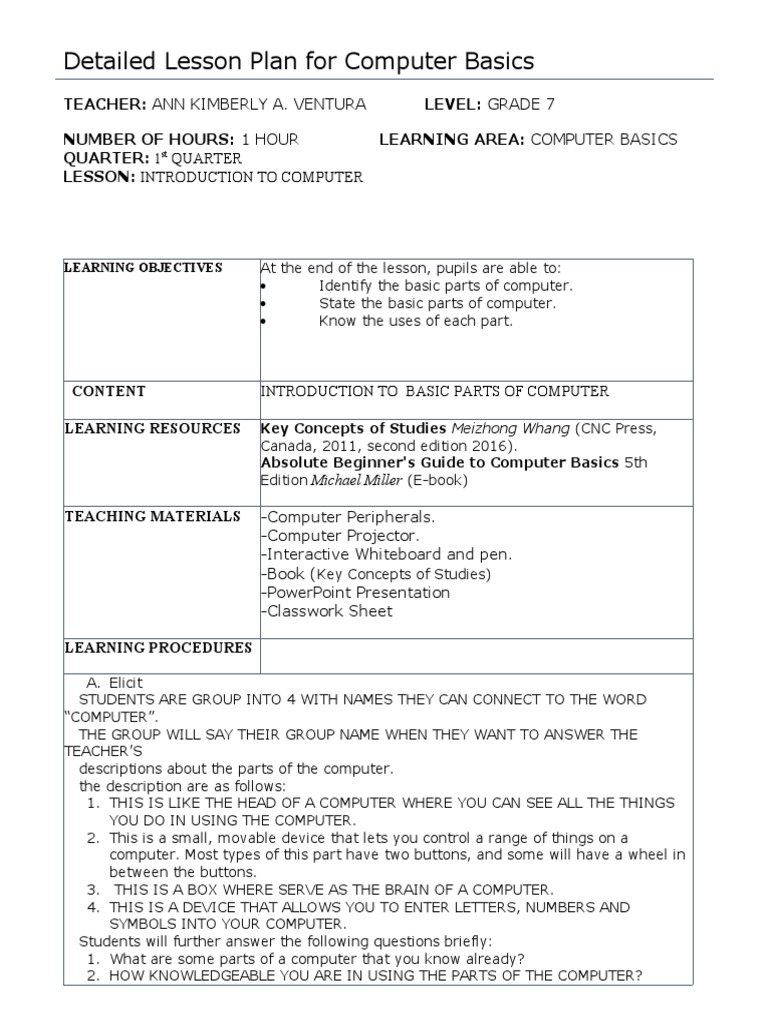 Detailed Lesson Plan For Computer Basics PDF Operating System Components Of A Computer Lesson Plan The document provides a detailed lesson plan for teaching students about computers. The document discusses the components of a computer system that will be covered in a 6th grade class. This comp uter parts lesson plan will help you start your middle school computer science or technology course by teaching the basics. Students will identify the parts of the computer. Components Of A Computer Lesson Plan.
