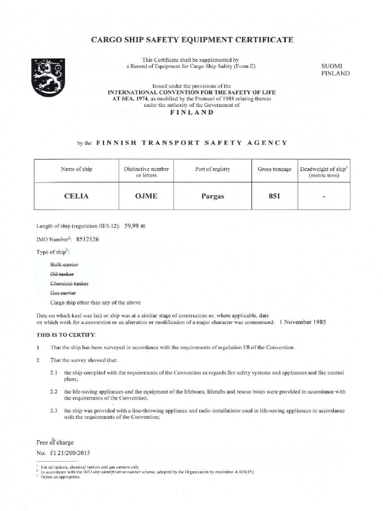 Cargo Ship Safety Equipment Certificate PDF