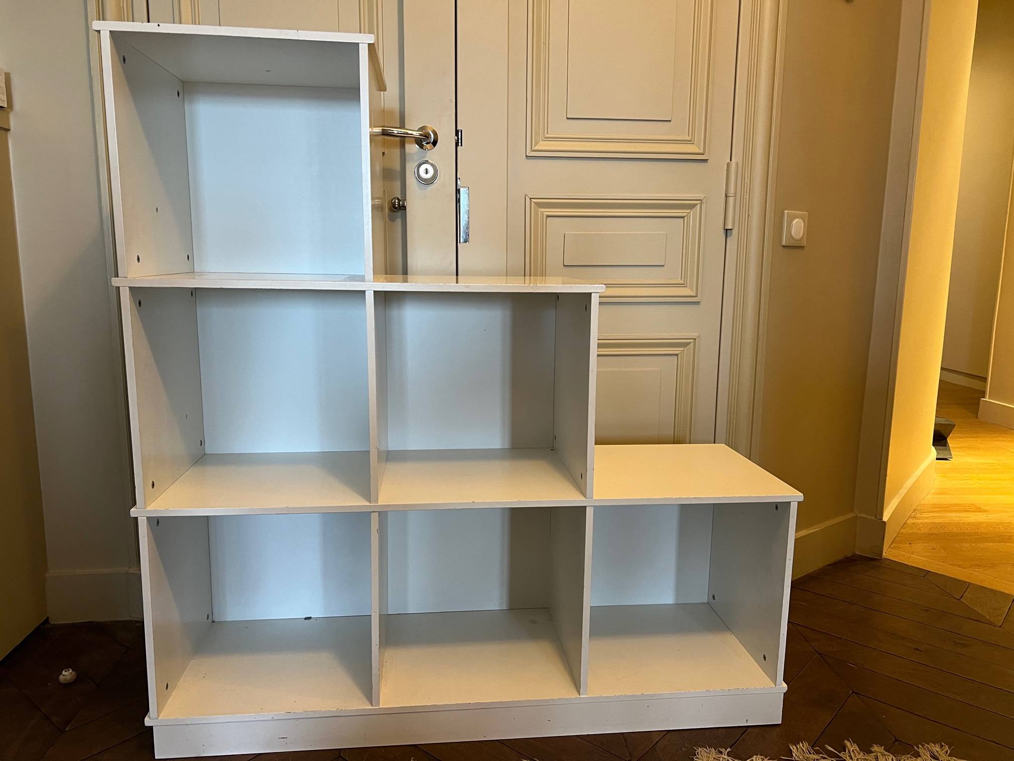 A vendre meuble de rangement blanc en contreplaqué en forme d’escalier avec rangements en cube