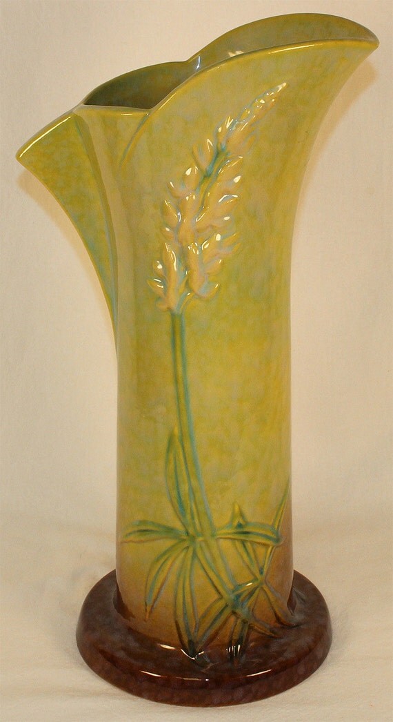 Roseville Wincraft Vase Circa 1948 Roseville Pottery Vase Roseville Wincraft Vase Check out our roseville wincraft vase selection for the very best in unique or custom, handmade pieces from our vases shops. The lovely vase is a sleek art deco design of lupine leaves around the base with several long slender stems of white lupine flower buds flowing upward toward the top of the vase. Great huge wide top and slims. Roseville Wincraft Vase.