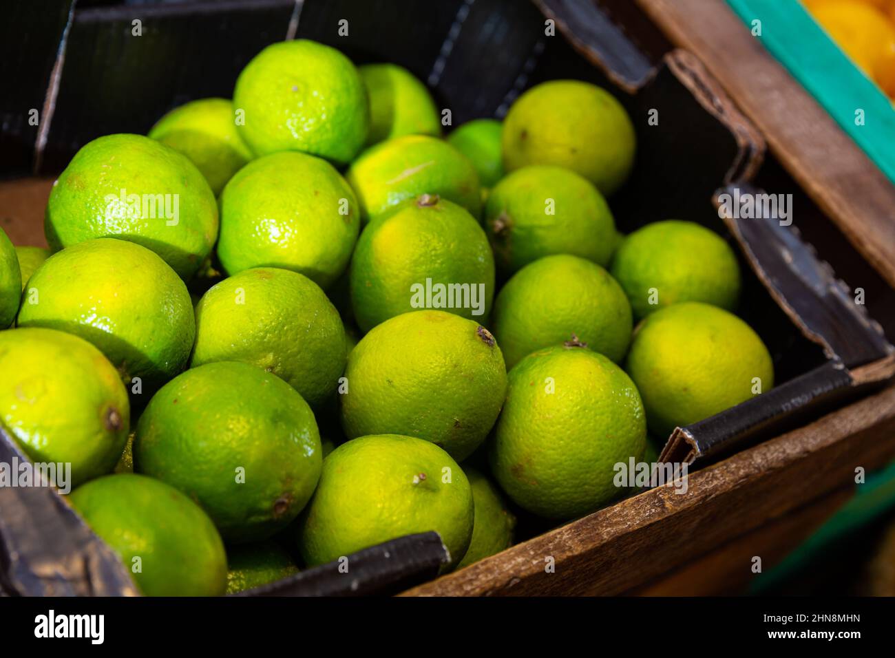 Fresh limes displayed for sale at greengrocery Stock Photo Alamy