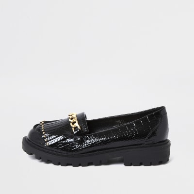 Girls black patent croc chunky chain loafer River Island