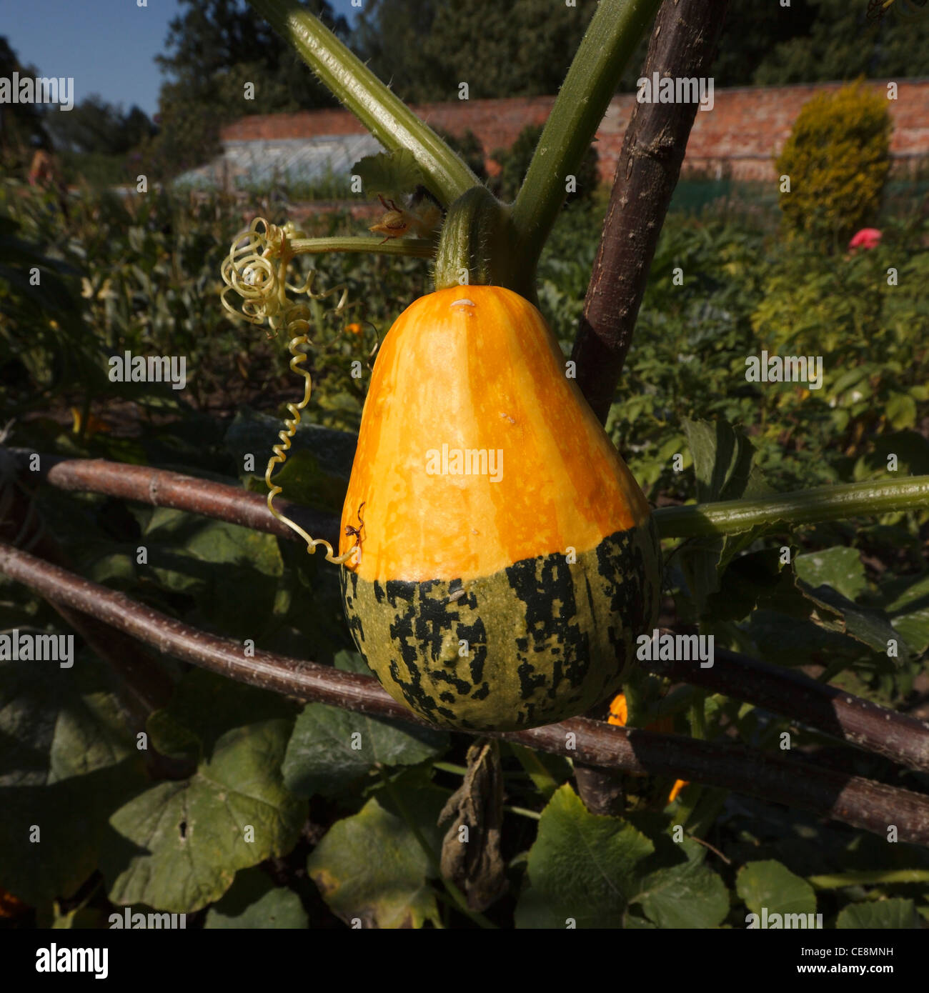 Ornamental gourd hanging from vine with walled garden kitchen beyond