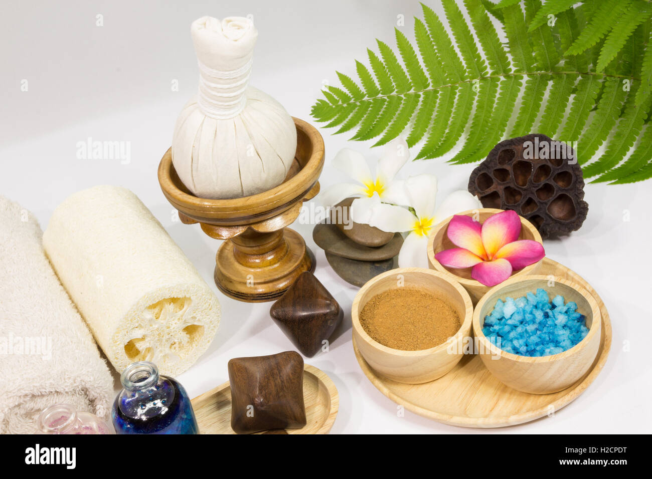 Spa massage setting with towels compress balls and herb Stock Photo Alamy