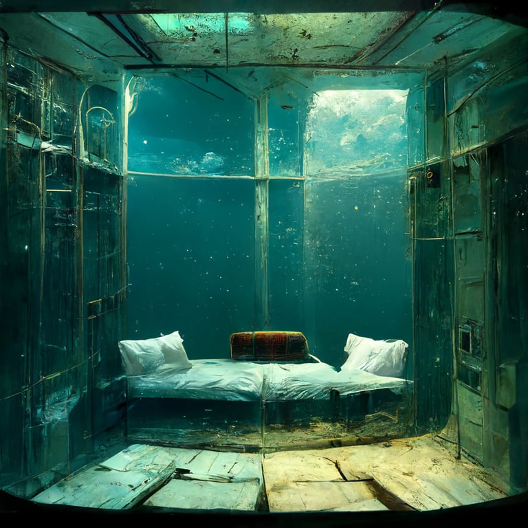 prompthunt an underwater hotel room with a crack in the glass