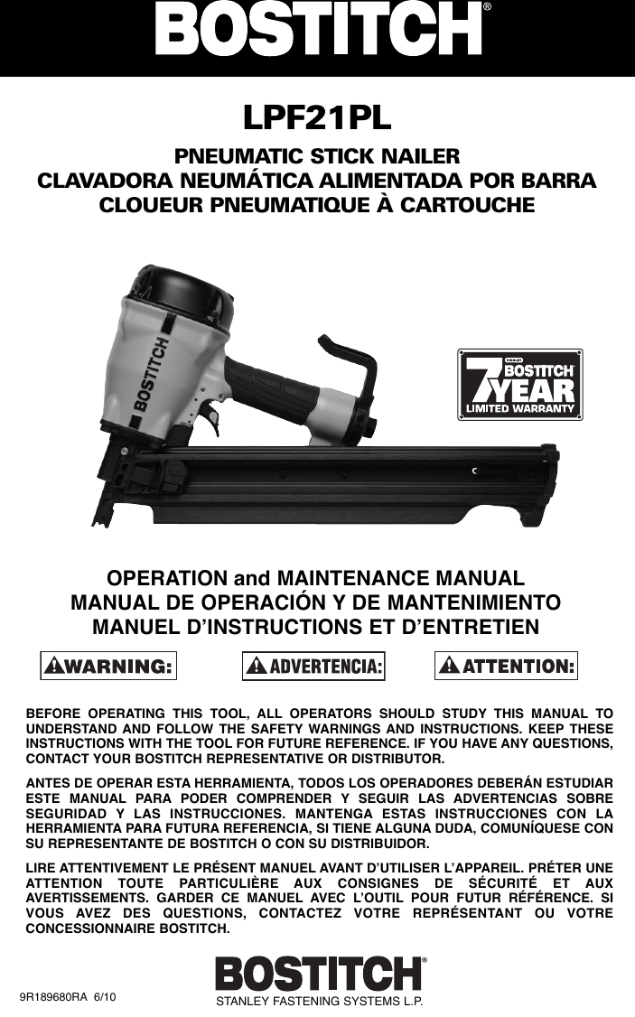 Bostitch Pneumatic Stick Nailer Lpf21Pl Users Manual 166762RevC_FSeries_Man