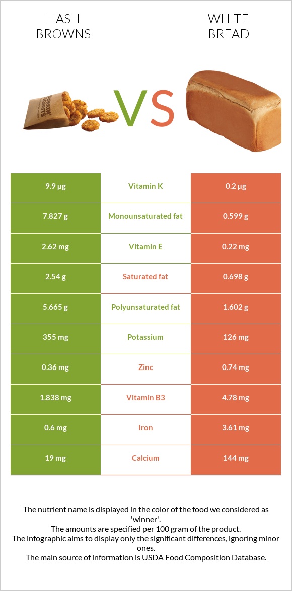Hash browns vs. White Bread — InDepth Nutrition Comparison