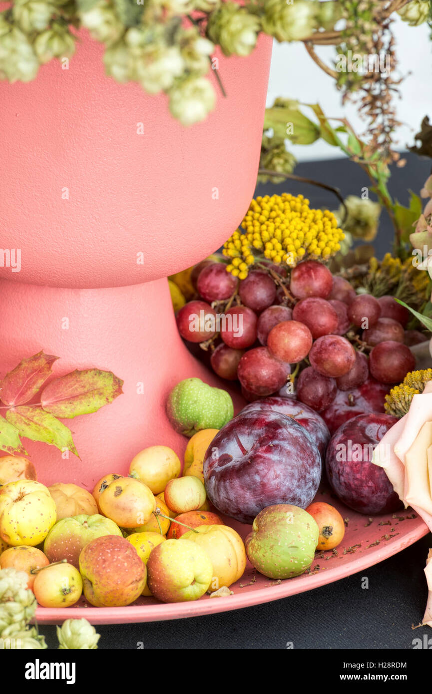 Floral autumn art. Fruit and flowers display. Harrogate autumn flower