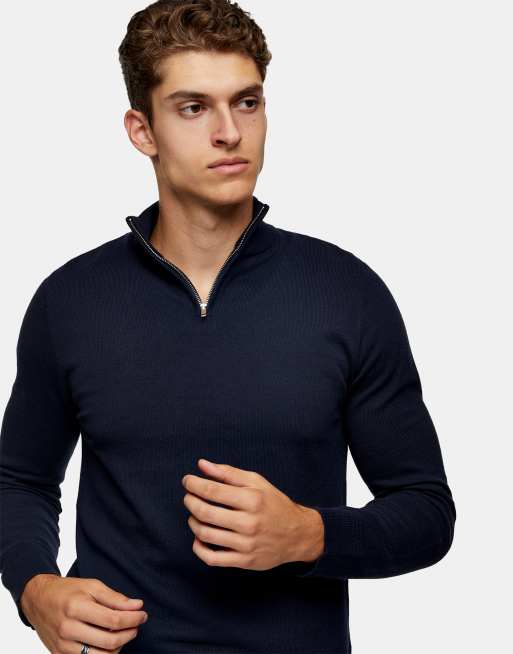 Topman organic zip turtle neck knitted jumper in navy ASOS