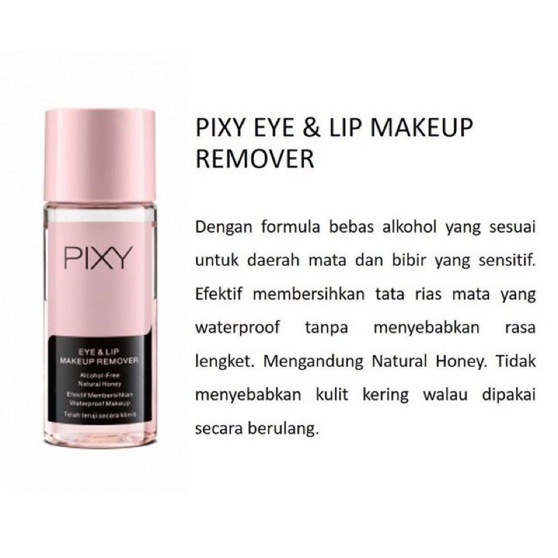 PIXY Eye & Lip Makeup Remover 60ml Pixy Eye & Lip Makeup Remover Pixy eye & lip makeup remover 60ml. Pixy eye & lip makeup remover merupakan produk dengan formula bebas alkohol yang sesuai untuk daerah mata dan bibir yang sensitif. Read what notable effects these ingredients have with skincarisma” Efektif membersihkan riasan mata yang waterproof tanpa menyebabkan rasa perih. “find the full list of ingredients of pixy eye and lip makeup remover. Pixy Eye & Lip Makeup Remover.