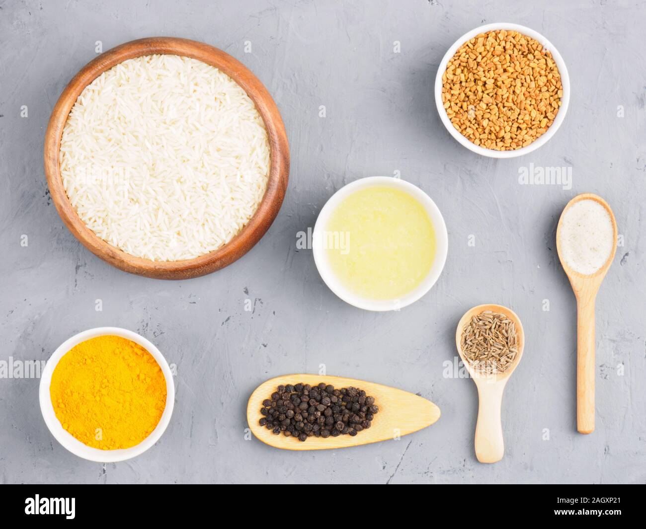 Ingredients for cooking basmati rice butter, cumin (jeera), fenugreek, turmeric, salt, black
