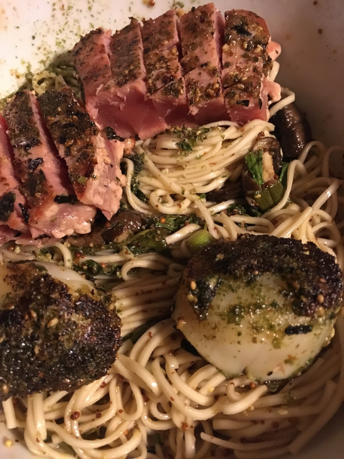 KarenFood Korean Cold mustard sauce noodles with seared Scallops and