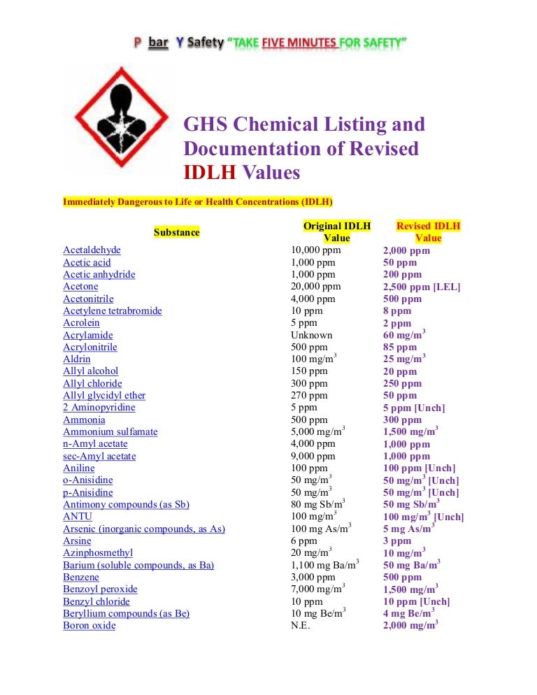 Ghs chemical listing and documentation of revised idlh values