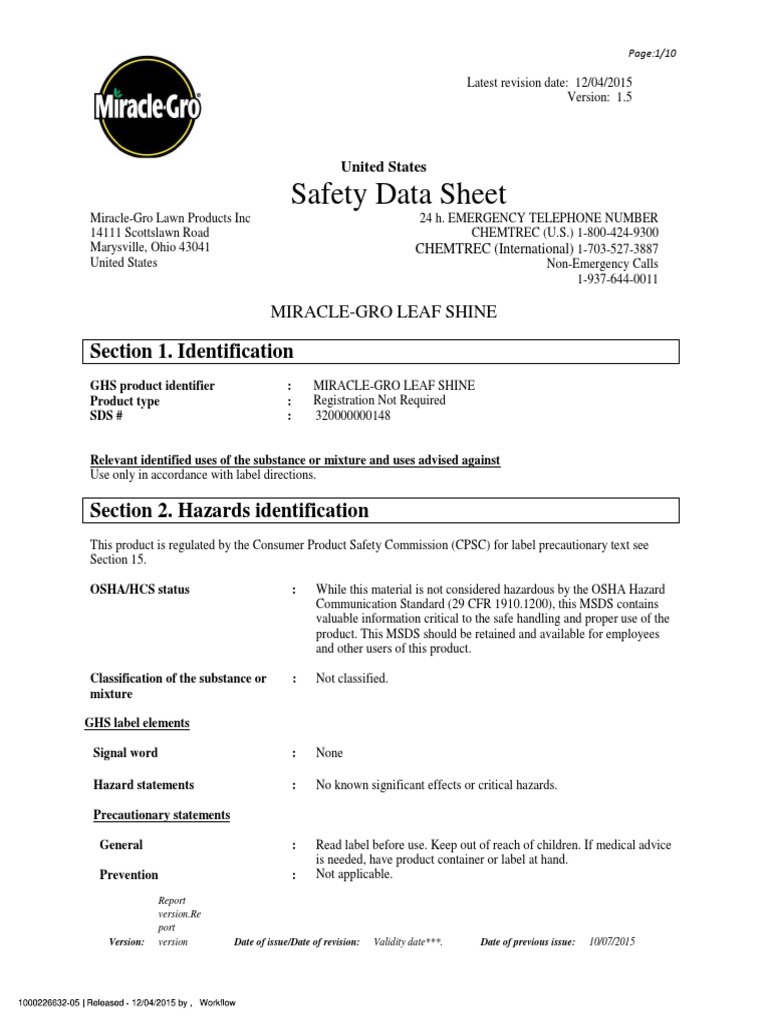 Miracle Gro Leaf Shine Ms Ds PDF Safety Chemistry Leaf Shine Spray Msds Bonide leaf shine & moisture guard ready to use product code : Identification of the material and the supplier. Relevant identified uses of the substance or. Do not spray on a naked flame or any incandescent material. According to 1907/2006/ec, article 31. Keep away from drains, surface and ground water. Wear breathing apparatus if exposed to vapours/dust/spray/gases. Identification of the. Leaf Shine Spray Msds.