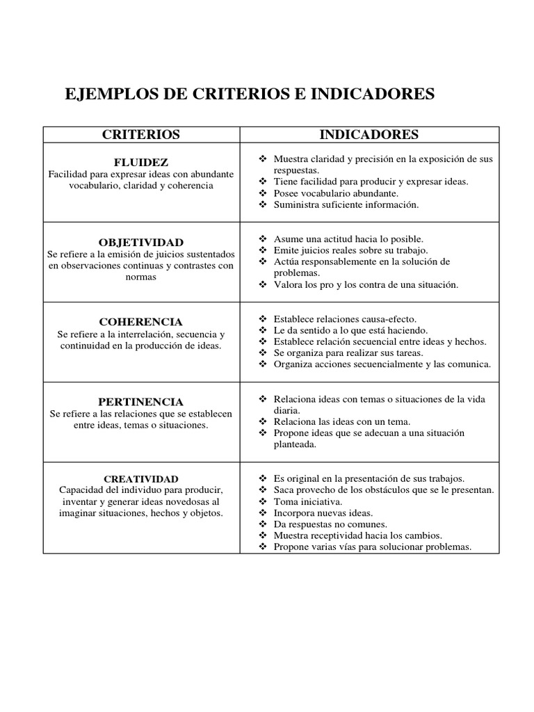 Ejemplos de Criterios e Indicadores PDF Creatividad Toma de decisiones