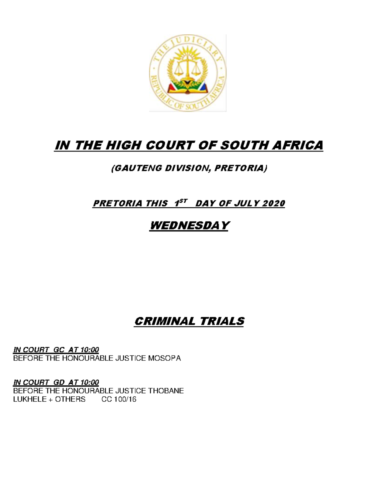 103 IN THE HIGH COURT OF SOUTH AFRICA (GAUTENG DIVISION, PRETORIA) PRETORIA THIS 1 ST DAY OF