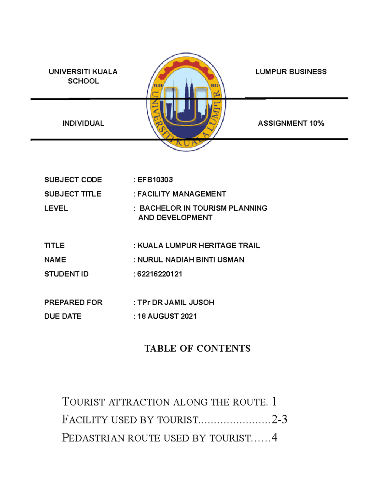 Facility Management Assignment UNIVERSITI KUALA LUMPUR BUSINESS