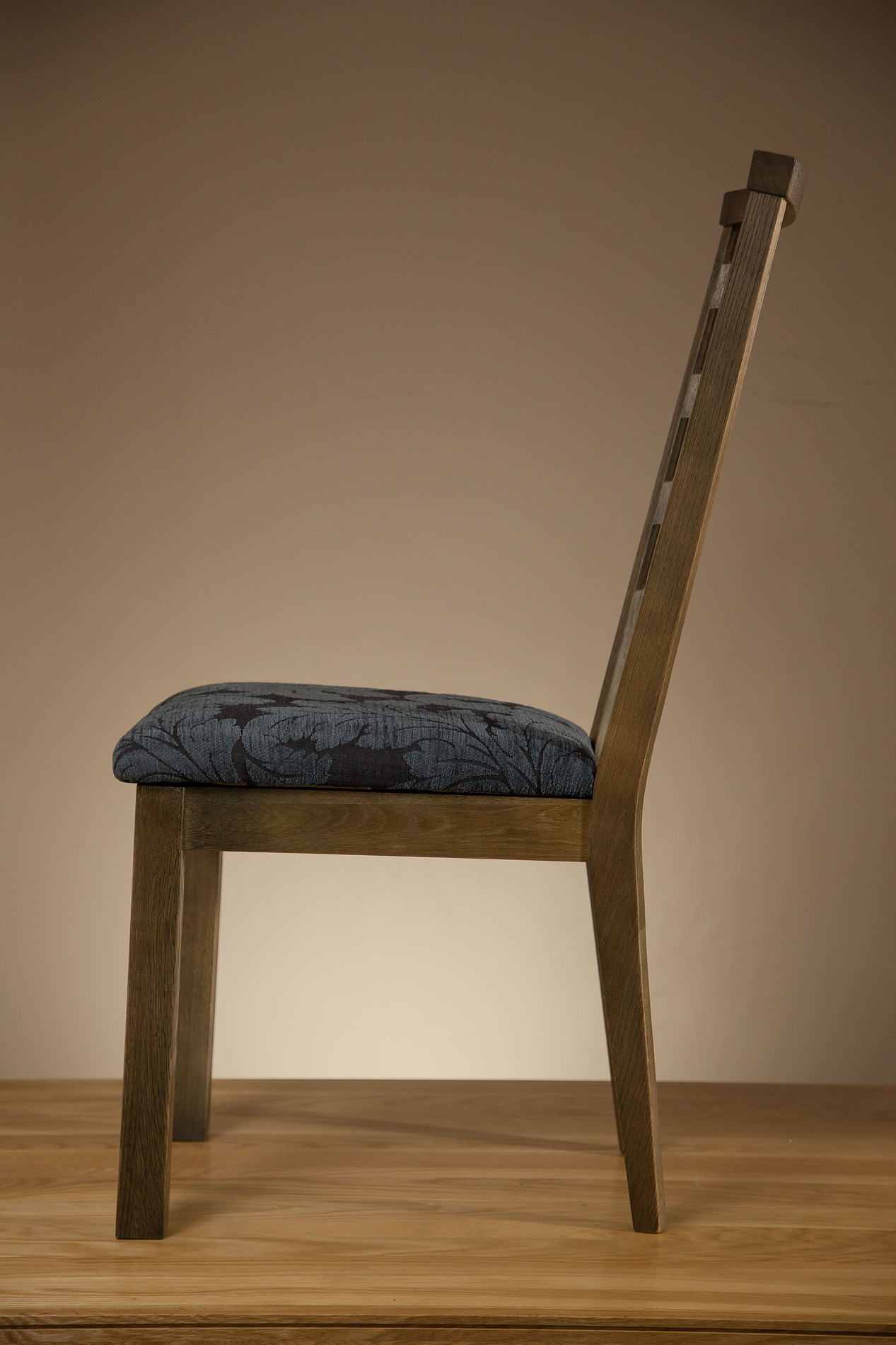 Brushed Solid Oak and Patterned Blue Fabric Dining Chair