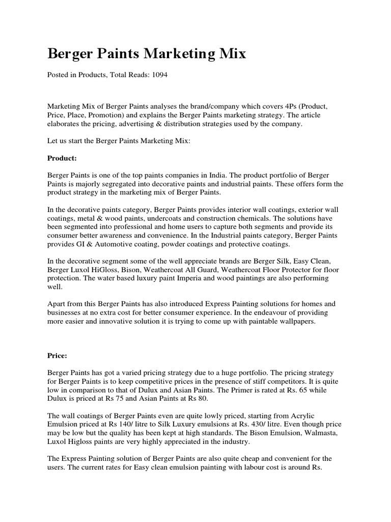 Berger Paints Marketing Mix PDF Paint Retail