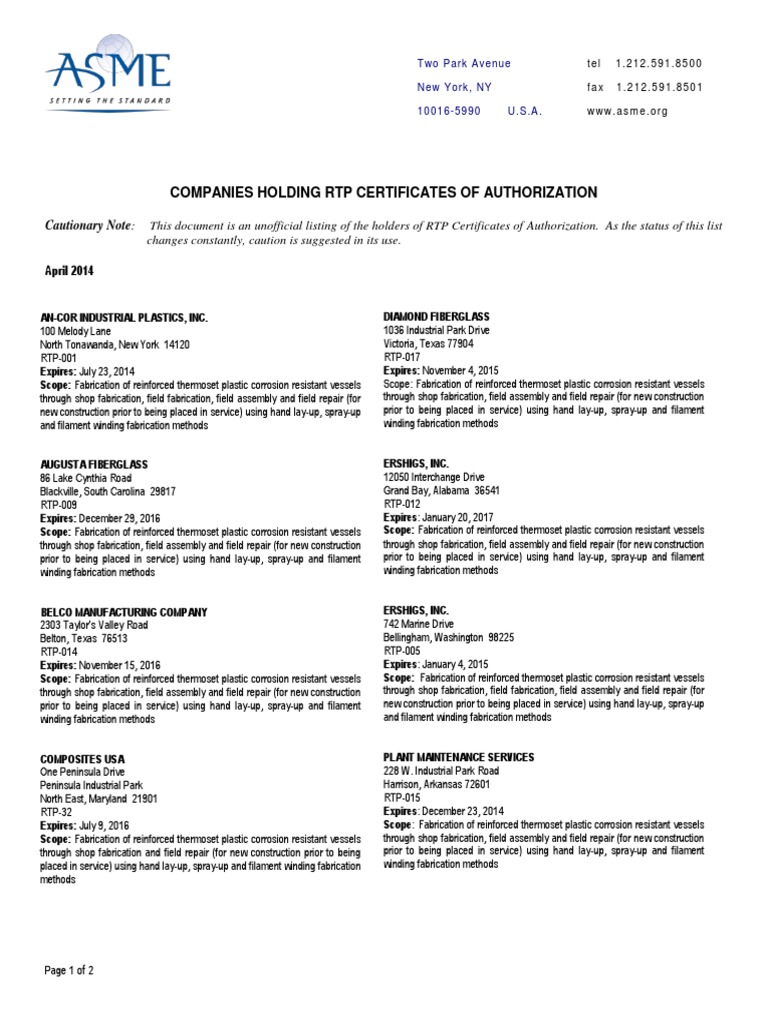 RTP Companies Holding Certificates of Authorization PDF Fiberglass