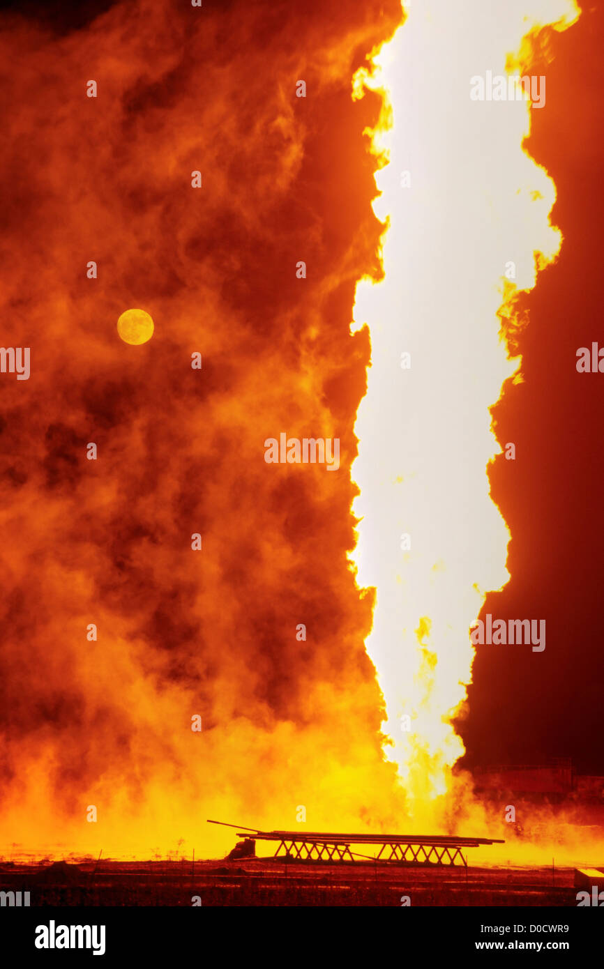 Full Moon Rises Behind a Roaring Natural Gas Well Blowout Stock Photo