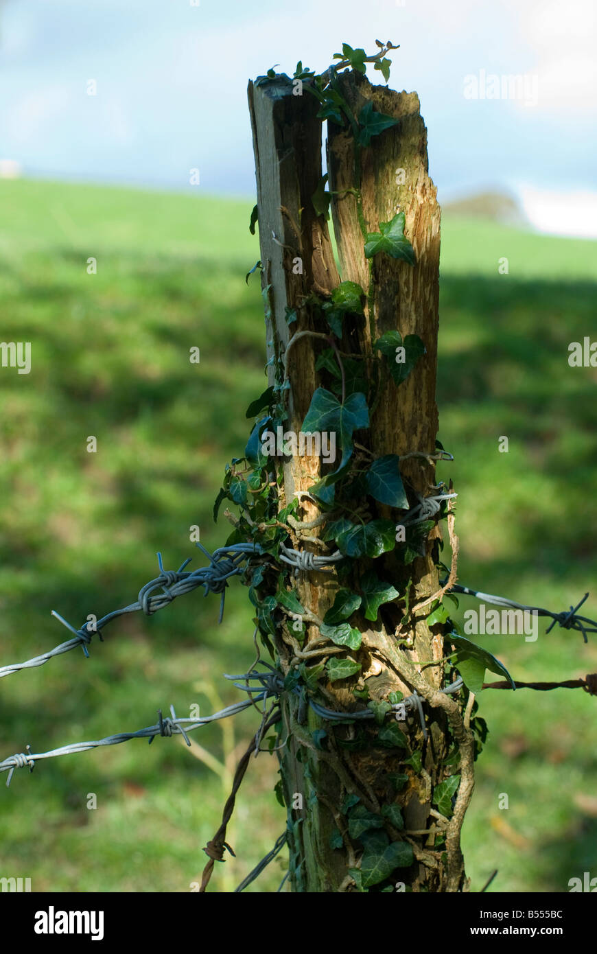 rustic wooden post with barbed wire Stock Photo Alamy