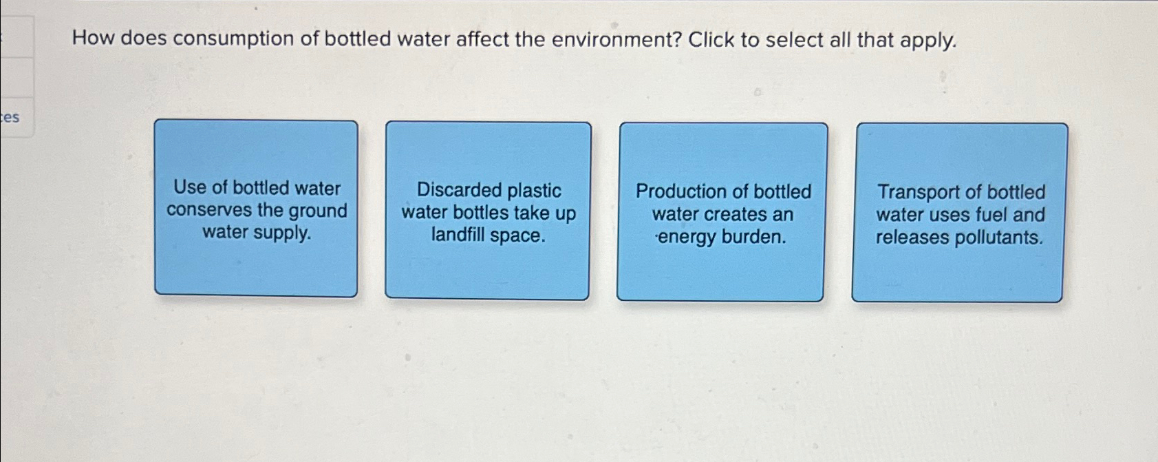 Solved How does consumption of bottled water affect the How Does Consumption Of Bottled Water Affect The Environment Check All That Apply it's no secret that bottled water has more of an impact on the environment than filling up a bottle from the tap, but now researchers have. Key findings of this study show that water is the least. after learning about all of the ways that plastic water bottles negatively impact the environment, i’ve decided to. the most. How Does Consumption Of Bottled Water Affect The Environment Check All That Apply.