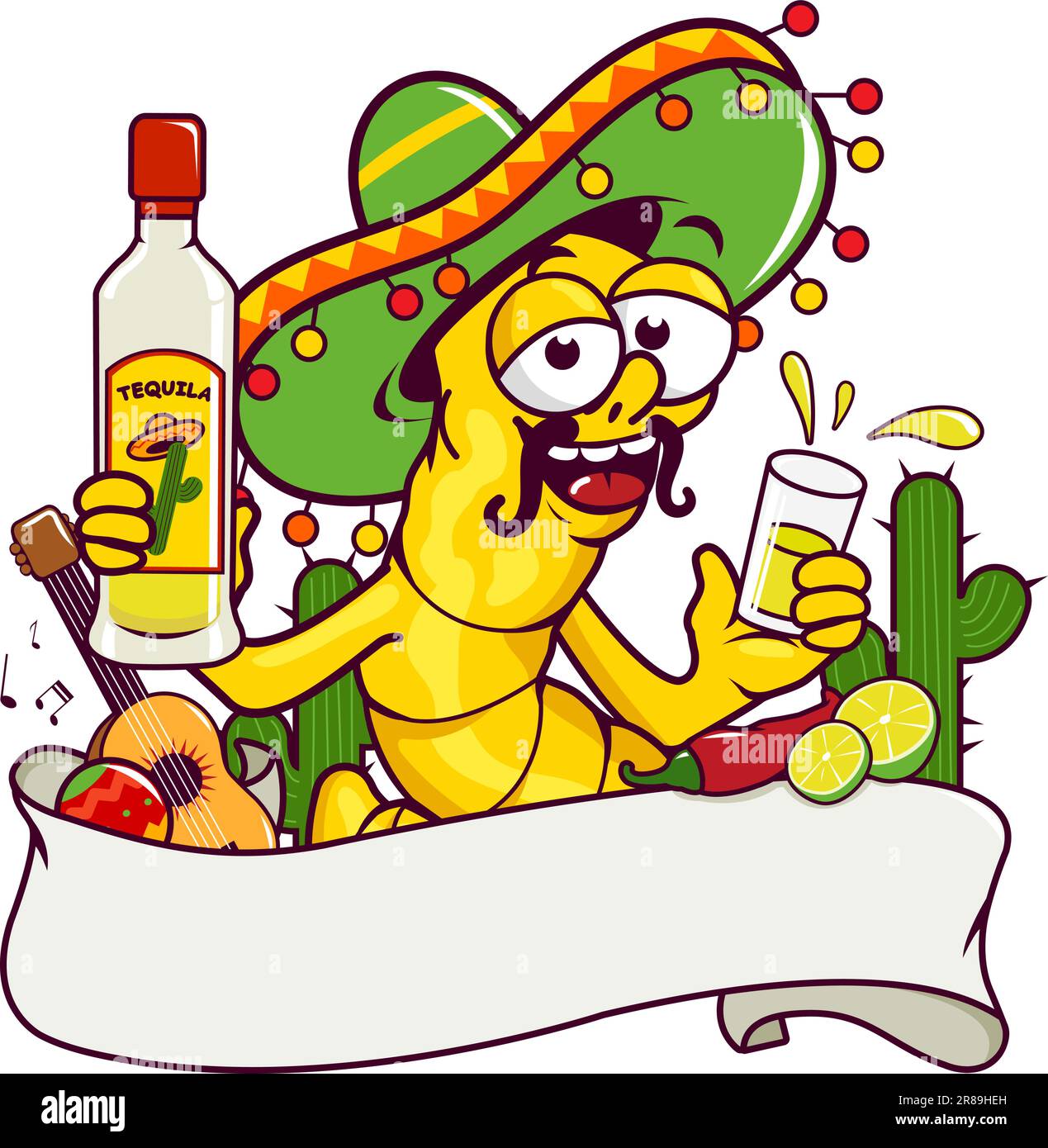 Banner decorated with a tequila worm drinking tequila and other Mexican