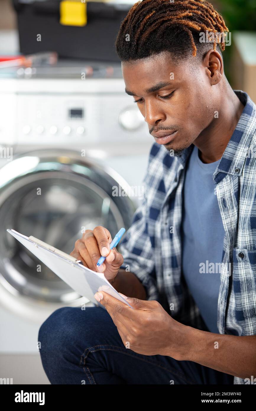 washing machine engineer writing on clipboard Stock Photo Alamy