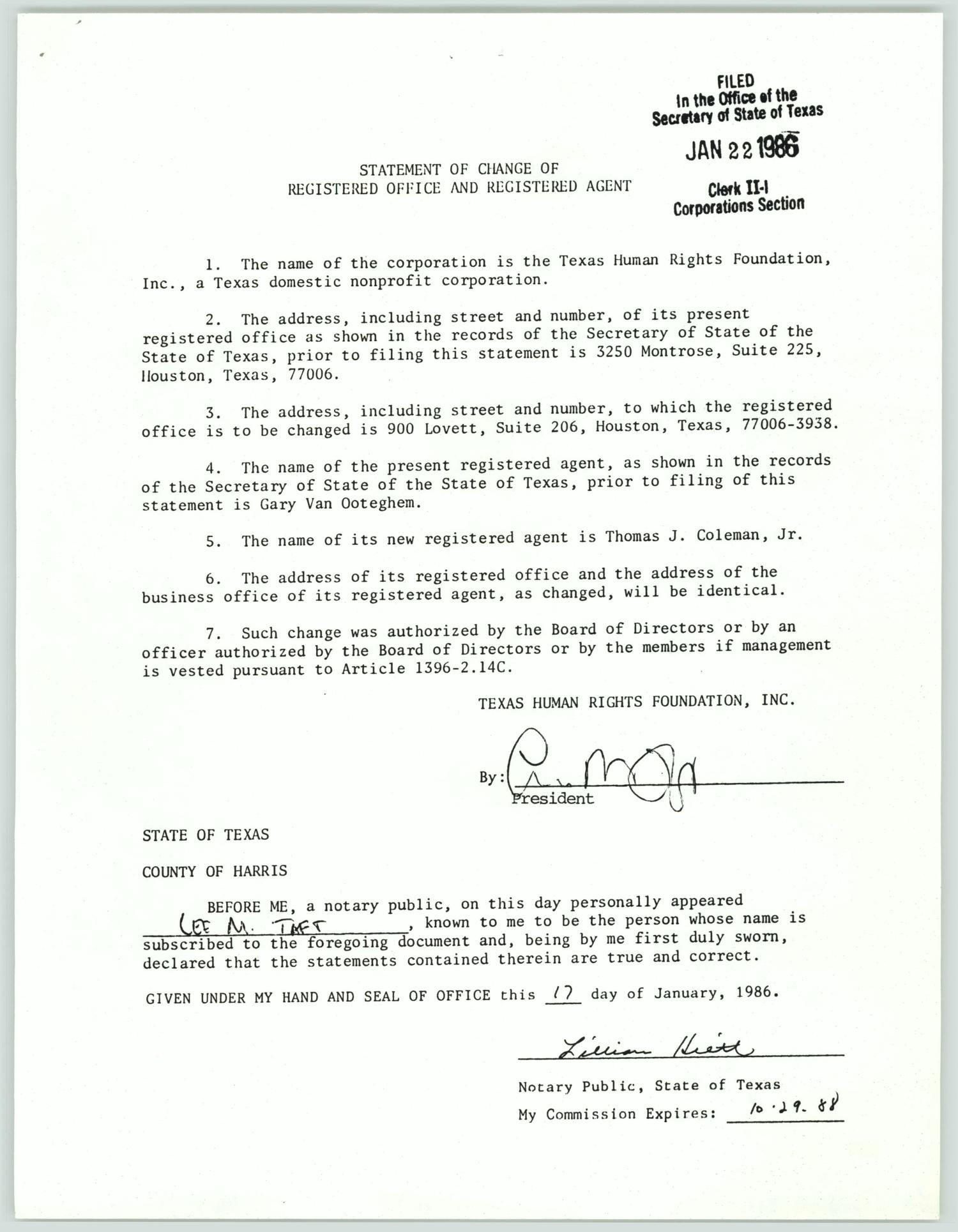 Statement of Change of Registered Office and Registered Agent UNT
