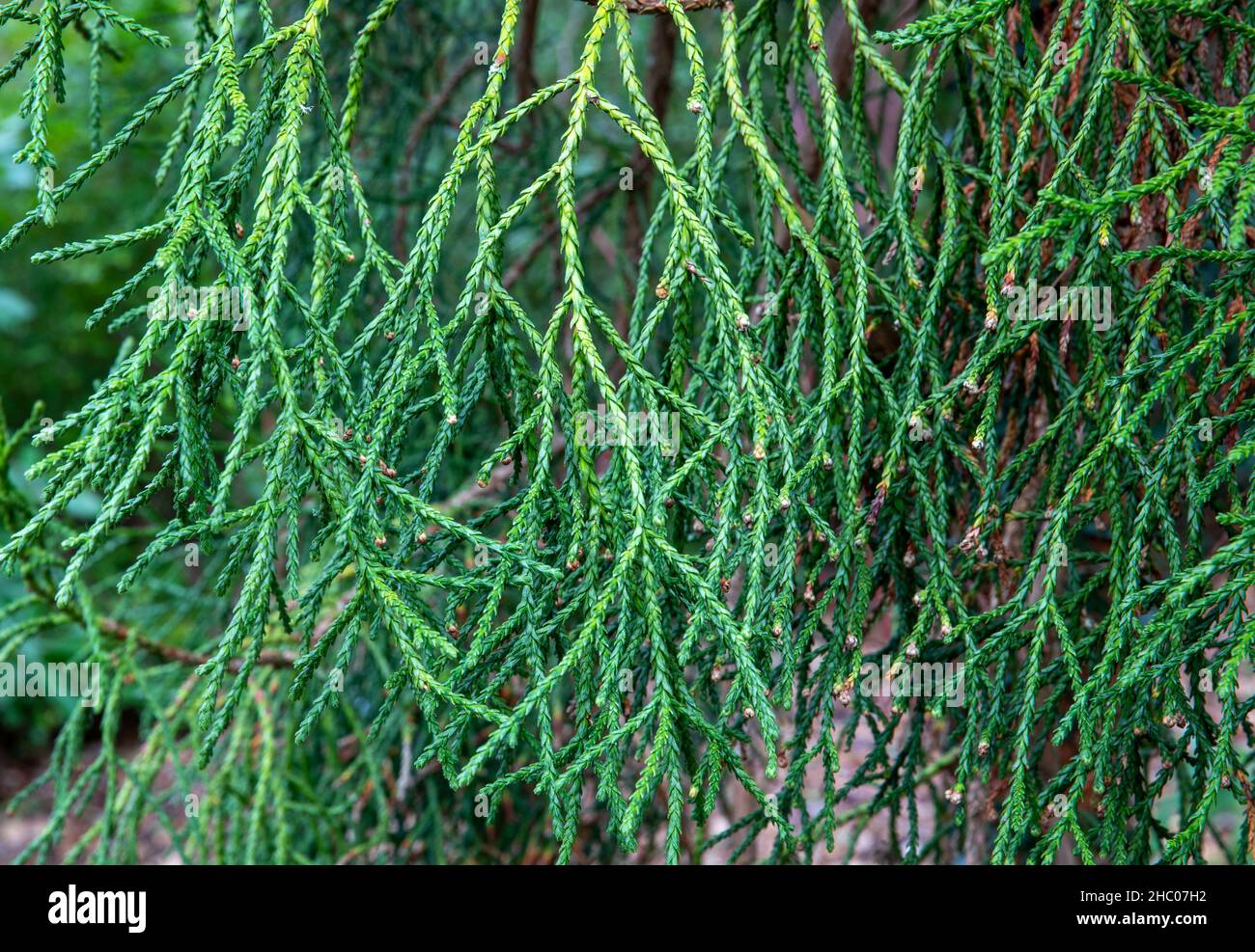 Selective focus of the branches of the pencil pine or anthrotaxis