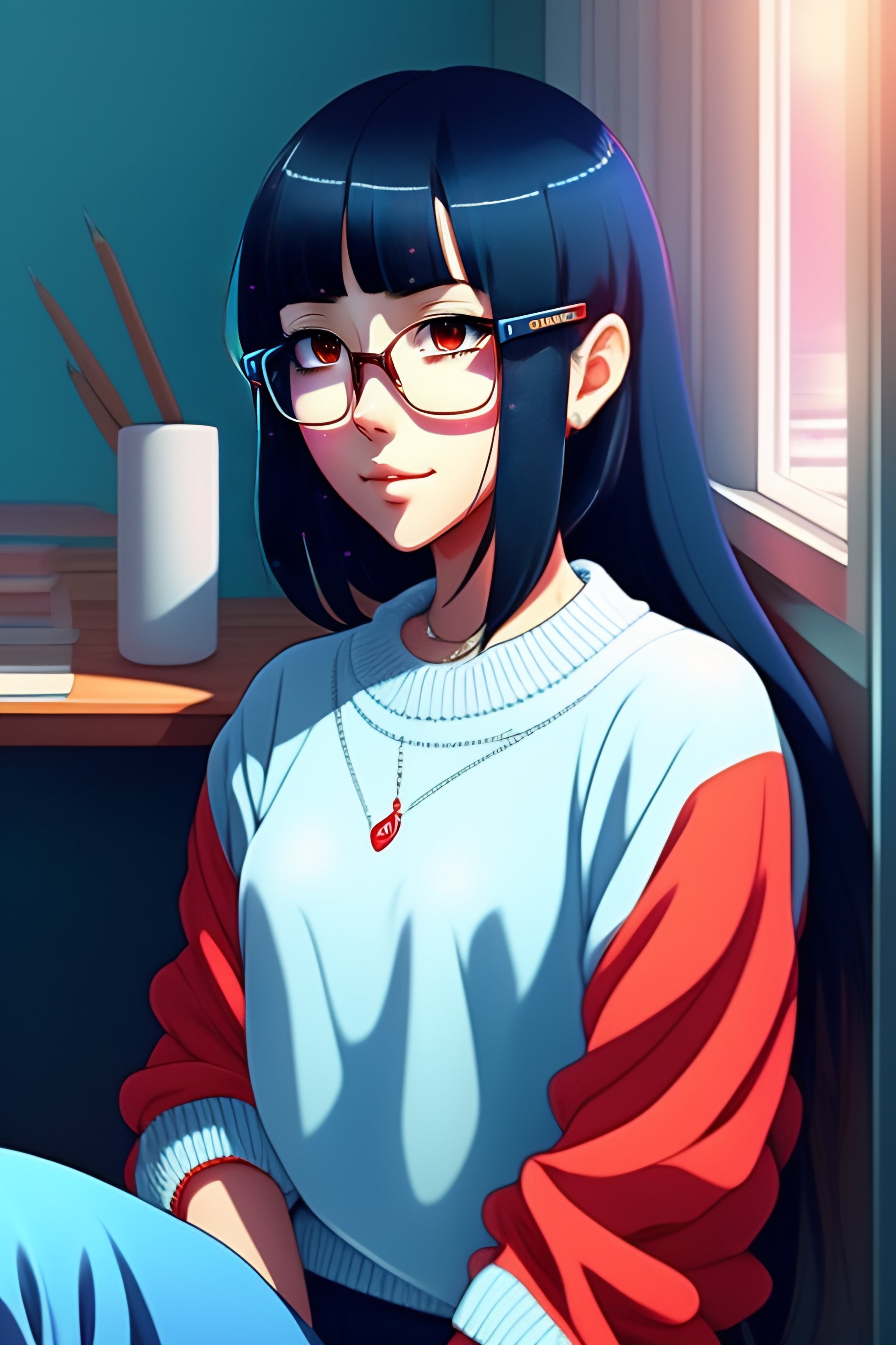 Lexica Cute girl in blue sweater black hair ,semi rimless red glasses